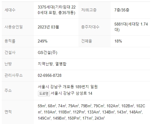 강남구 개포동 189번지 일대, 개포주공 4단지 주택재건축 정비사업 일환, 지에스 건설 시공으로 2023년 2월 입주한 3,375세대 대단지 아파트로 개포동역, 대모산입구역, 대청역 역세권, 초/중/고 도보 통학, 직주근접, 상업인프라 등 최고의 입지로 실거주하기에 매우 좋은 단지이기도 합니다.