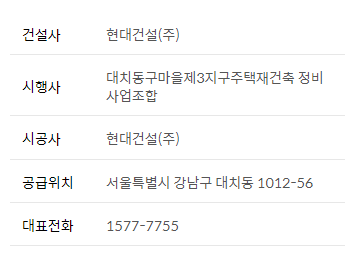 - 강남구 대치동 1012-56 일대를 대치동구마을 제3지구 재건축정비사업 일환으로 현대건설이 시공을 맡아 건설될 아파트입니다.