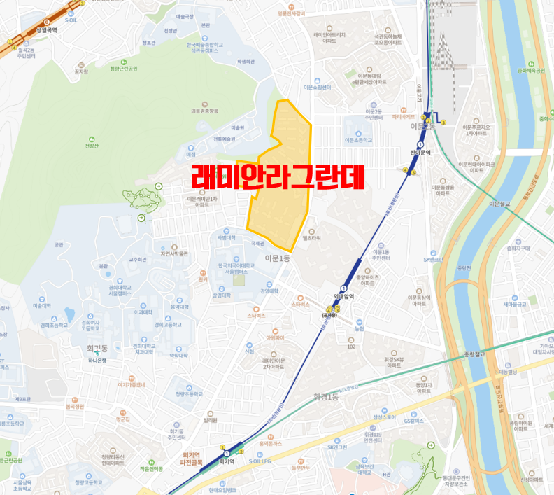 - 학군 : 초등학교는 이문초(200m), 청량초(981m, 배정초등학교)가, 중학교는 경희중(785m), 경희여중(1km), 청량중(1.6km)가, 고등학교는 경희여고(1km), 청량고(1.5km), 휘봉고(1.7km)가 있습니다. 이문동과 휘경동 일대 이문휘경뉴타운으로 재개발 진행 중이라 단지 주변의 학원가는 현재 거의 없어 조금 아쉽지만, 뉴타운사업이 어느 정도 마무리되는 시점에는 많은 학원가가 조성될 것으로 보입니다.