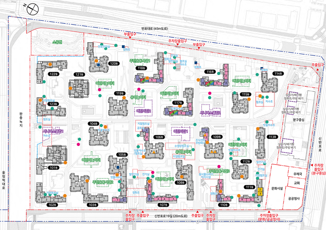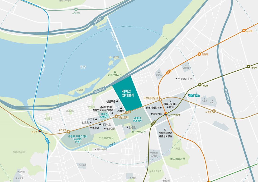 - 교통 : S급 교통입지입니다. 지하철 3, 7, 9호선 고속터미널역을 도보 8분(약 415m), 9호선 신반포역을 도보 5분(205m) 이내로 이동할 수 있으며, 지하철 이용 시, 강남역까지 약 10분, 판교역까지 약 25분, 광화문역까지 약 30분, 여의도역까지 약 15분 이내로 이동할 수 있습니다. 또한 자가용 이용 시 올림픽대로, 반포대교, 경부고속도로를 통하여 수도권 주요업무지구 및 지방도시로 수월하게 이동할 수 있으며, 신반포 중앙차로에는 광역, 간선, 지선버스 노선이 많아 버스이용도 편하게 할 수 있습니다.