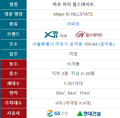 공덕동 105-84 일대 공덕1구역 주택재건축 정비사업 일환으로 GS건설과 힐스테이트 컨소시엄으로 건설될 단지입니다. 해당 입지는 지하철, 2호선, 6호선, 5호선, 경의중앙선, 공항철도를 전부 도보로 이동할 수 있는 쿼트러플 역세권 단지로 인근 종로, 광화문, 여의도가 모두 가까워 직주근접할 수 있습니다. 학교와 각종 상권인프라가 잘 형성되어 있어 실거주하기에 좋은 아파트입니다.