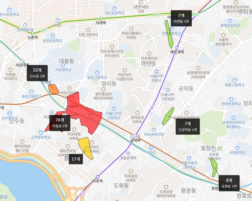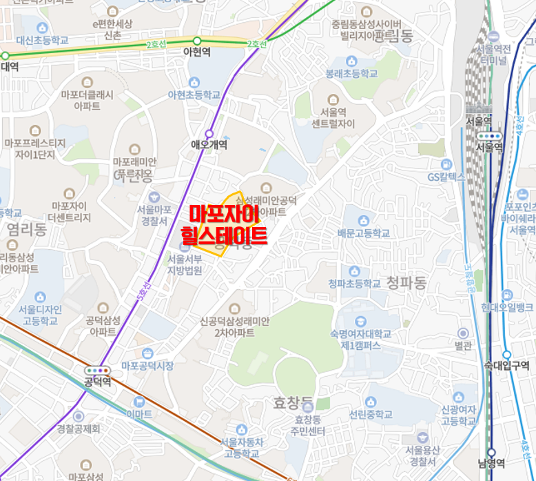 - 학군 : 초등학교는 소의초(355m)가, 중학교는 아현중(662m), 서울여중(848m), 동도중(1.1km)이, 고등학교는 숭문고(1.1km), 환일고(544m), 서울여고(879m)가 있어 도보로 통학이 가능합니다. 다만, 주변이 상업업무지구의 성격이 강해 학원가는 많이 형성되지 않았습니다. 학원가는 대흥역 주변 혹은 아현동 주변 학원가를 이용해야 합니다.