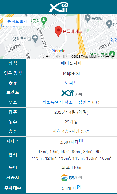 메이플자이는 잠원역 초역세권에 지어질 단지로 총 3,307세대(일반분양 162세대)의 대단지 아파트입니다. 2024년 2월 5일에는 특별공급 청약이, 6, 7일에는 1순위 일반공급 청약이, 8일에는 2순위 일