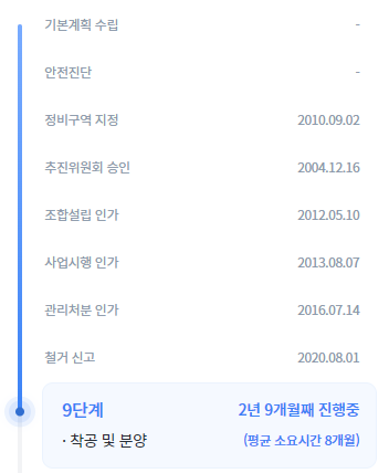 2012년 5울에 조합설립 인가를 2016년 7월에 관리처분 인가를, 2020년 8월에 철거를 하였고, 현재는 분양을 예정하고 있습니다. * 2016년에 관리처분인가를 득하여 초과이익환수제가 적용되지 않는 단지입니다.(재초환 대상은 2018년 1월 1일 이후 관처를 신청한 단지임)