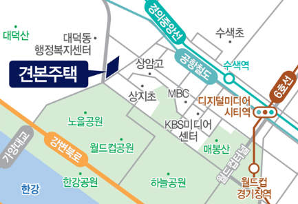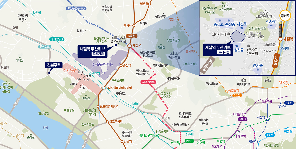 - 교통 : 단지 인근에 지하철 6호선 새절역을 도보로 약 8분 내(550m)로 이동할 수 있으며, 인근에는 경의중앙선 디지털미디어시티역(새절역에서 한 정거장)이 위치해 있습니다. 지하철 이용시 강남역까지는 약 70분, 광화문까지는 약 30분, 여의도역까지는 약 27분 이내 소요됩니다. 또한 자차 이용 시 강변북로와 성산대교가 인접하여 주요 업무지구로의 접근이 용이합니다.