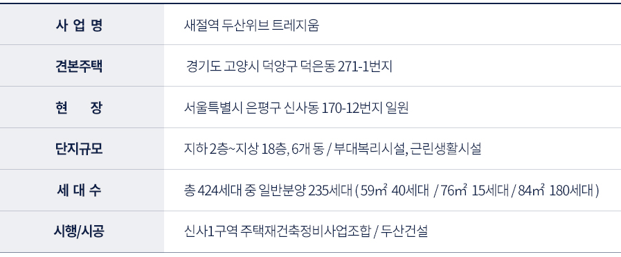 새절역두산위브트레지움은 신사1구역 주택재거축 정비사업의 일환으로 건설될 단지로 은평구 신사동 170-12번에 위치하며, 시공은 두산건설이 진행하고 있습니다. 지하 2층부터 지상 18층까지, 총6개동 규모로 단지가 지어지며, 지하철 6호선 새절역을 도보로 이용할 수 있으며, 초, 중, 고등학교 모두 인접해 있습니다. 또한 단지 인근에 불광천, 공원이 있어 쾌적한 자연환경도 누릴 수 있어 실거주하기에 괜찮은 아파트로 보입니다. 분양물량은 총 424세대 중 일반분양 235세대입니다.