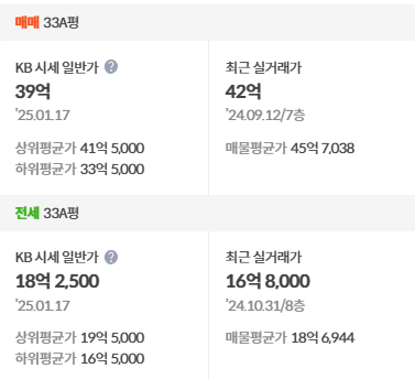 전용 84㎡, 매매 실거래가는(2024.11.13.) 40억 3천만원(최근 최고가 2024.9.12. 42억원), 매물평균가는 45억 7,038만원, kb시세는 39억원이며, 전세 실거래가는(2024.10.31.) 16억 8천만원, 매물평균가는 18억 6,944만원, kb시세는 18억 2,500만원입니다.