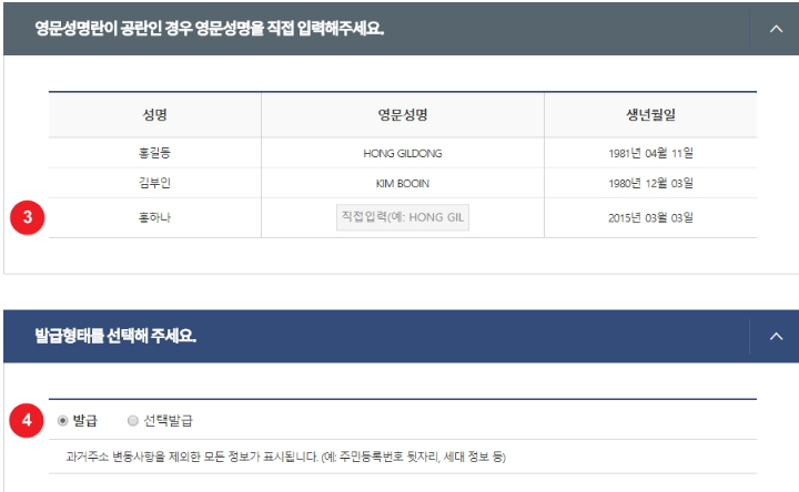 4. 영문성명란이 비어있다면, 직접 영문성명을 입력합니다.(여권상 영문 스펠링을 입력하면 됩니다.) 그리고 발급 형태를 선택합니다. 왼쪽의 발급을 선택하면, 모든 정보와 이력이 표시되며, 오른쪽의 선택 발급을 선택하면, 과거 주소의 변동사항, 주민등록번호 등 필요한 부분만 선택하여 발급을 하실 수 있습니다.
