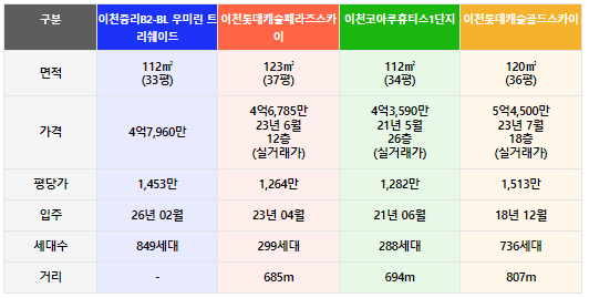 - 주변 단지의 실거래가와 비교해 보면, 이천롯데캐슬골드스카이(평당 약 1,513만원), 이천 우미린 트리쉐이드(평당 약 1,453만원), 이천코아루휴티스1단지(평당 약 1,282만원), 이천롯데캐슬패라즈스카이(평당 약 1,264만원) 순으로 가격이 높습니다. 해당 단지의 가격은 2번째이며, 연식을 고려해 보면 괜찮은 분양가로 보입니다.