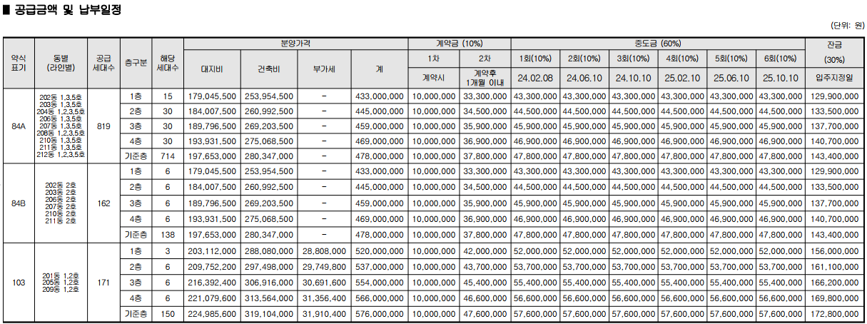 전용면적 84㎡ 의 분양가는 최저 43,300만원, 최고, 47,800만원입니다.(최고가 기준으로 평당가는 1,448만원) 인근 단지들과 평당 가격비교를 해보면, 지제역더샵센트럴시티, 지제역 반도체밸리 제일풍경제, 제일풍경채장당센트럴 순으로 가격이 높았습니다. 특히 22년식인 지제역더샵센트럴시티의 평당가는 1,741만원입니다.