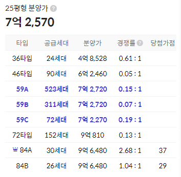 전용면적 84㎡을 제외, 전 평형 미달로 청약이 마감되었습니다. 가장 경쟁률이 높았던 타입은 84A로 2.68:1, 가장 경쟁률이 낮았던 타입은 46 타입으로 0.05:1이 었습니다. 아무래도 금리인상과 부동산 하락장 속 청약의 영향을 받은 듯합니다.(물론 당시 고분양가 영향도 있었습니다.)