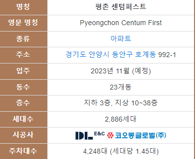 안양시 동안구 호계동 992-1번지, 덕현지구 주택재개발 정비사업 일환, 디엘이엔씨와 코오롱글로벌 컨소시엄으로 건설될 총 2,886세대 대단지 아파트로 (참고로 초기 착공 시 아파트 이름이 e편한세상 하늘채 평촌센텀퍼스트였으며, 22년 11월 평촌센텀퍼스트로 최종 변경하였습니다.) 단지 인근 초, 중, 고가 있어 도보 통학 가능(평촌학원가 이용 가능), 다양한 상업인프라, 동탄/인덕원선 호재 등 실거주로서 괜찮은 단지이기도 합니다. 다만, 단지 남쪽 안양교도소가 위치하는 점은 해당 단지의 최대 단점입니다.(2030년까지 철거한 후 문화와 공원으로 조성될 예정이라고 합니다.) 입주는 23년 11월 예정되어 있습니다.