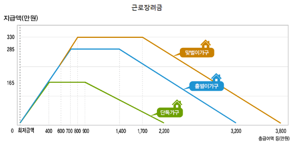 - (근로장려금) 단독가구 2,200만원, 홑벌이가구 3,200만원, 맞벌이가구 3,800만원